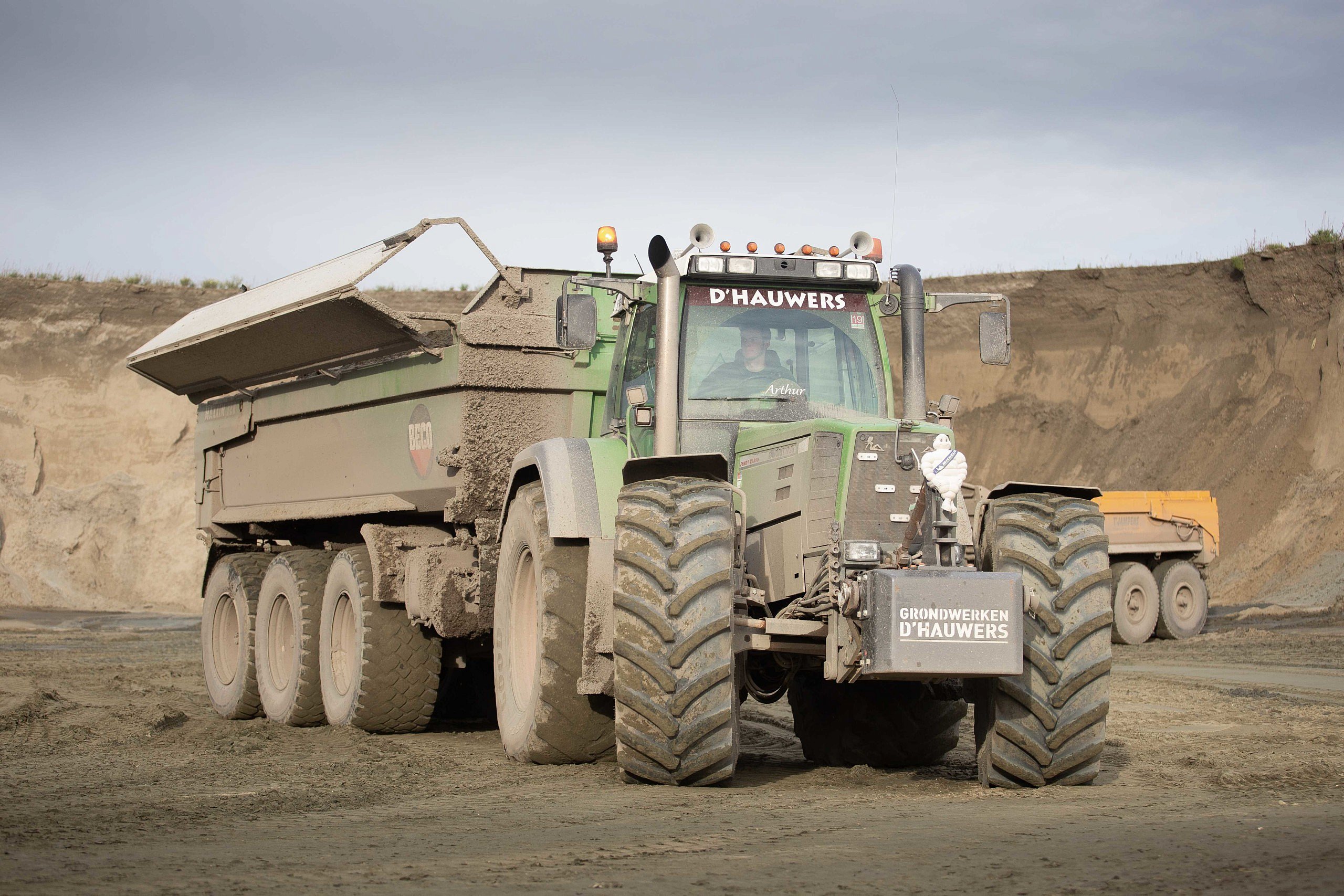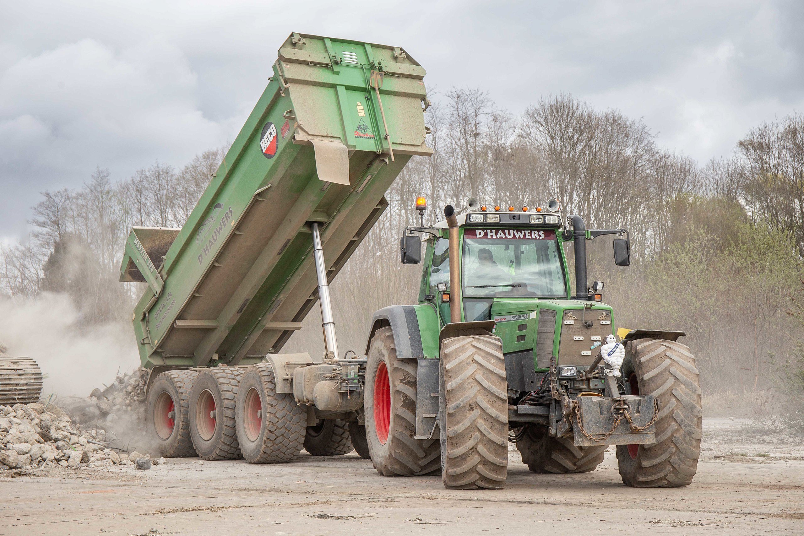 De bekendste combinatie van firma D’Hauwers is de Fendt 926 Favorit in combinatie met de groene Beco drie-asser. “Het is een trekker die al lang meegaat op het bedrijf en momenteel 16.000 uren op de teller heeft.” Voor Nicolas was het altijd een droom om met de Fendt Favorit 926 in combinatie met een drie-assige gronddumper te rijden. In het begin stond de trekker vooral voor de drie-assige containerhaak, maar vanwege het slechte comfort kwam hij voor de Beco drie-asser te staan. In combinatie met de disselvering van Beco is het comfort in de cabine dag en nacht verschil in vergelijking met de containerhaak volgens Nicolas. “Ik heb zelf nog even getwijfeld om luchtvering onder de cabine te plaatsen, maar dat is nu niet meer nodig.” Zelf zit Nicolas niet achter het stuur van zijn favoriete trekker. Dat is ingenomen door één van zijn vaste chauffeurs. “Ik ben enorm blij als ik in het weekend zelf even achter het stuur mag kruipen”,lacht Nicolas. Nicolas is van plan om de trekker rond de 20.000 uren op pensioen te sturen. “Dit is het beste naar betrouwbaarheid voor de klant toe. We willen niet te veel in panne staan.” De trekker verkopen doet Nicolas nooit. “Desnoods komt hij in de woonkamer in een glazen kast.” Uit interesse en liefde voor de Favorit-reeks is er onlangs nog een Fendt 824 Favorit aangekocht om het rijtje compleet te maken.