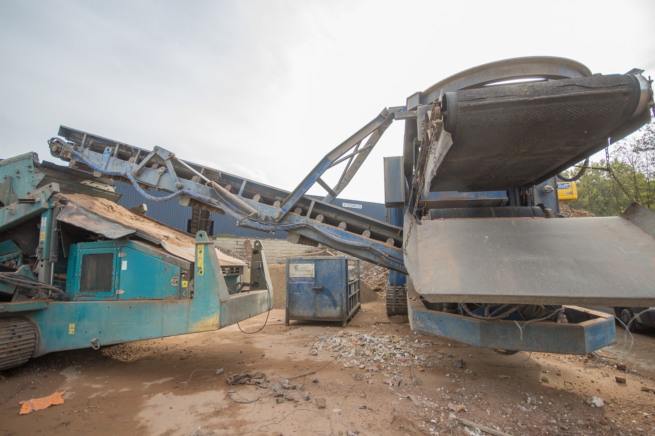 Niet zo standaard Slechts weinig, om niet te zeggen geen, machines die in de Benelux geleverd worden zijn standaard. “We gaan altijd op zoek naar de ideale combinatie voor de klant”, vertelt Freddy Gillis van GM Recycling. Typische aanpassingen zijn een verlengde voorzeef tot 3,5m en een pivoterende, traploos in hoogte regelbare topmagneet van 6 ton . De verlengde voorzeef is onafhankelijk en bestaat uit 2 etages met op het bovendek drie roosters in trap gemonteerd, waardoor puin tijdens het schudden ook tuimelt. Het is een detail dat de capaciteit van de zeef enorm vergroot. De topmagneet is, in tegenstelling tot een dwarsmagneet, in de lengterichting van de afvoerband geplaatst. Het gebroken materiaal valt van de afvoerband onder de schudgoot op de lange afvoerband, en net daar is de magneetwerking het hardste. Door de vallende beweging is er meer ruimte tussen het gebroken materiaal, waardoor ook kleine ijzerdeeltjes gemakkelijker aangetrokken worden door de magneet. “Een andere aanpassing die op quasi alle machines doorgevoerd wordt is de Direct Drive”, vertelt Freddy nog. Bij de Direct Drive is de rotor rechtstreeks aangedreven door de motor. Deze directe aandrijving zorgt voor een daling van het verbruik met ongeveer 50 % en een rendementsstijging van 30 %. Gecombineerd met een dikkere en verzwaarde rotor van 12 ton zorgt dit eveneens voor minder slijtage aan de machine.