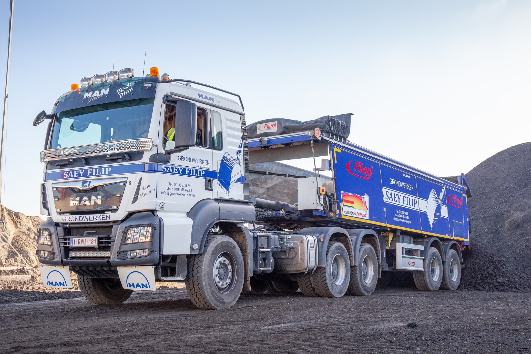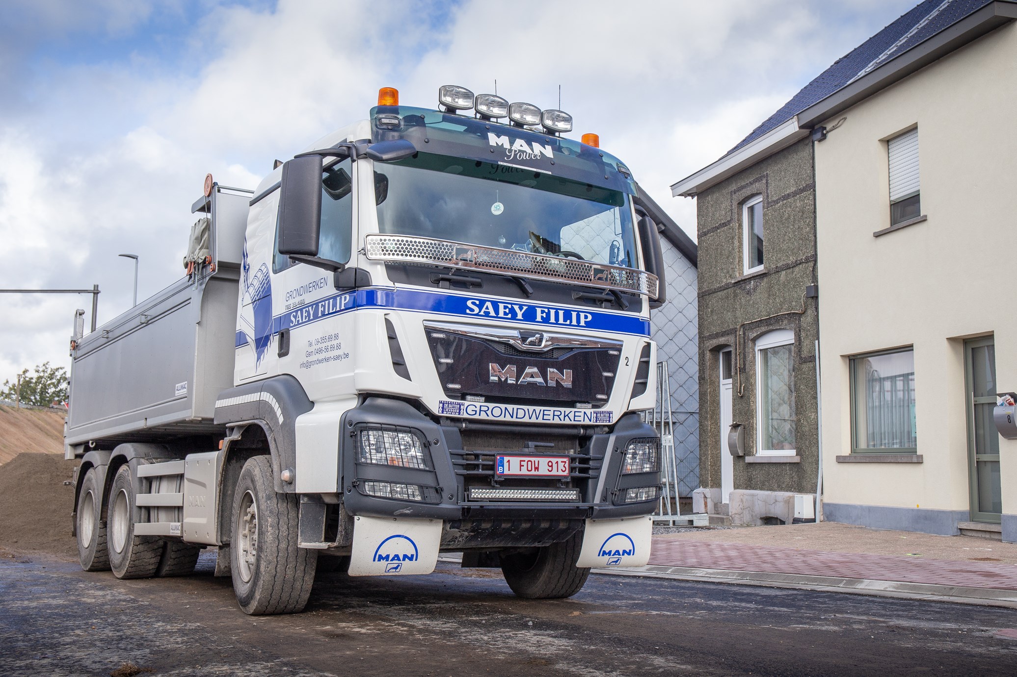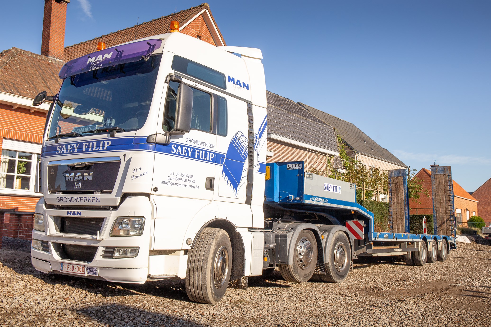 Filip zelf heeft lang met Doosan gewerkt, maar sinds enkele jaren maakt Caterpillar deel uit van het machinepark. Zelf heeft het bedrijf altijd opengestaan voor andere merken van graafmachines. “Zo kom je met veel mensen in contact en gun ik iedereen iets,” vertelt Flip. Zelf kunnen ze bij de verschillende soorten merken ook terecht als een bepaalde machine defect is. Momenteel lopen er kranen van Hitachi, Doosan, Kobelco, Hyundai en Caterpillar op het bedrijf, maar er is altijd ruimte voor nog een ander merk. “Op sommige werven worden soms specifieke merken van kranen gevraagd, zo stel ik ook mijn klanten tevreden.” Volgens Filip heeft elk merk een bepaald type kraan dat heel goed is voor specifieke taken. Zo gebruikt hij het liefst een Doosan om te nivelleren, een Kobelco als het gaat over een binnendraaier en een Caterpillar om zware lasten te tillen. Op vlak van tractoren heeft het bedrijf heel lang samengewerkt met New Holland, waarvan er nog verschillende worden ingezet. Ook de Fendt-tractoren, meestal in het zwart gespoten, maken nu deel uit van de grondverzettractoren. Het vrachtwagenpark bestaat vooral uit MAN, maar op eigen initiatief kocht Filip sinds kort ook een Mercedes en een DAF. Ook Scania deed zijn intrede door dochter Lisa.