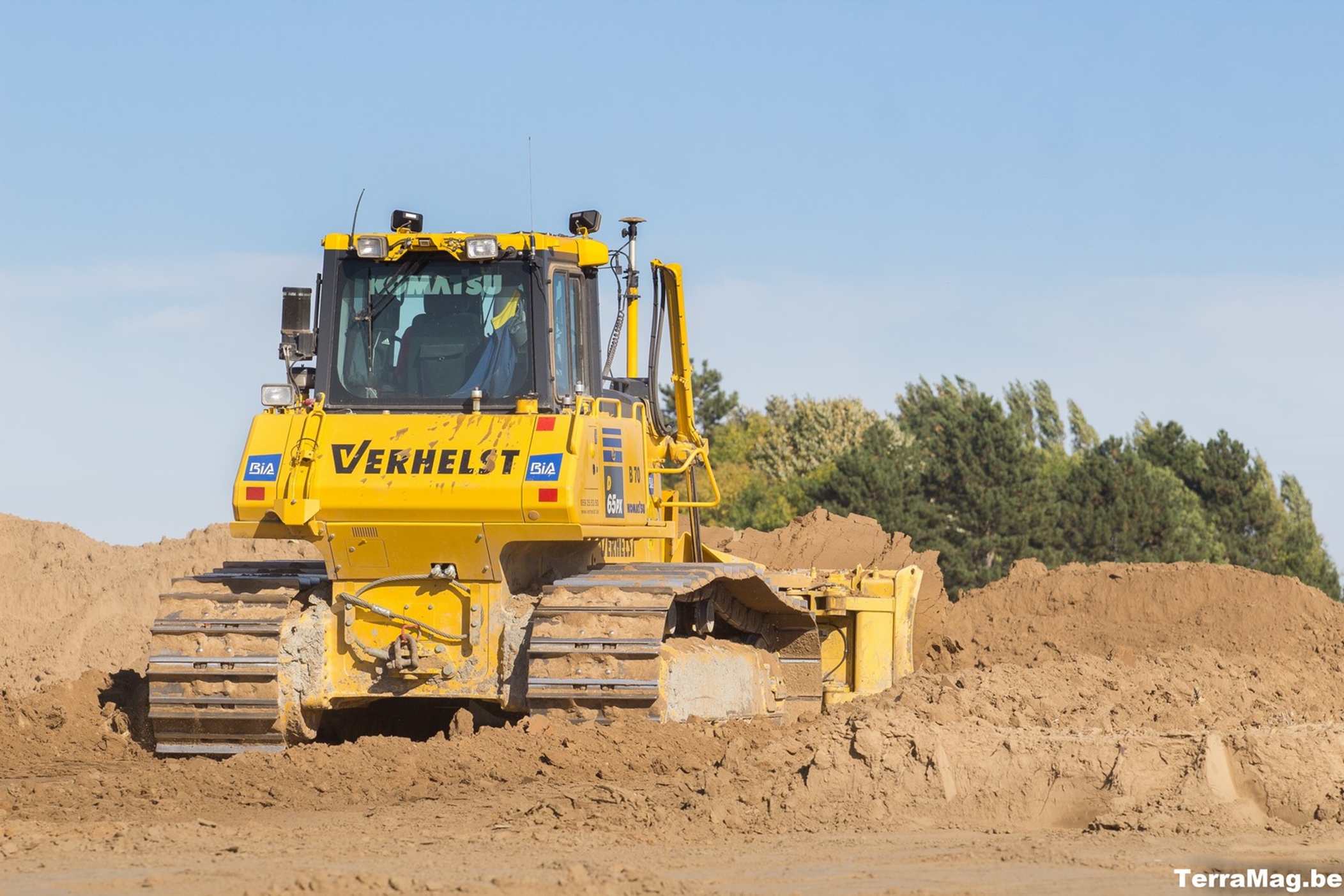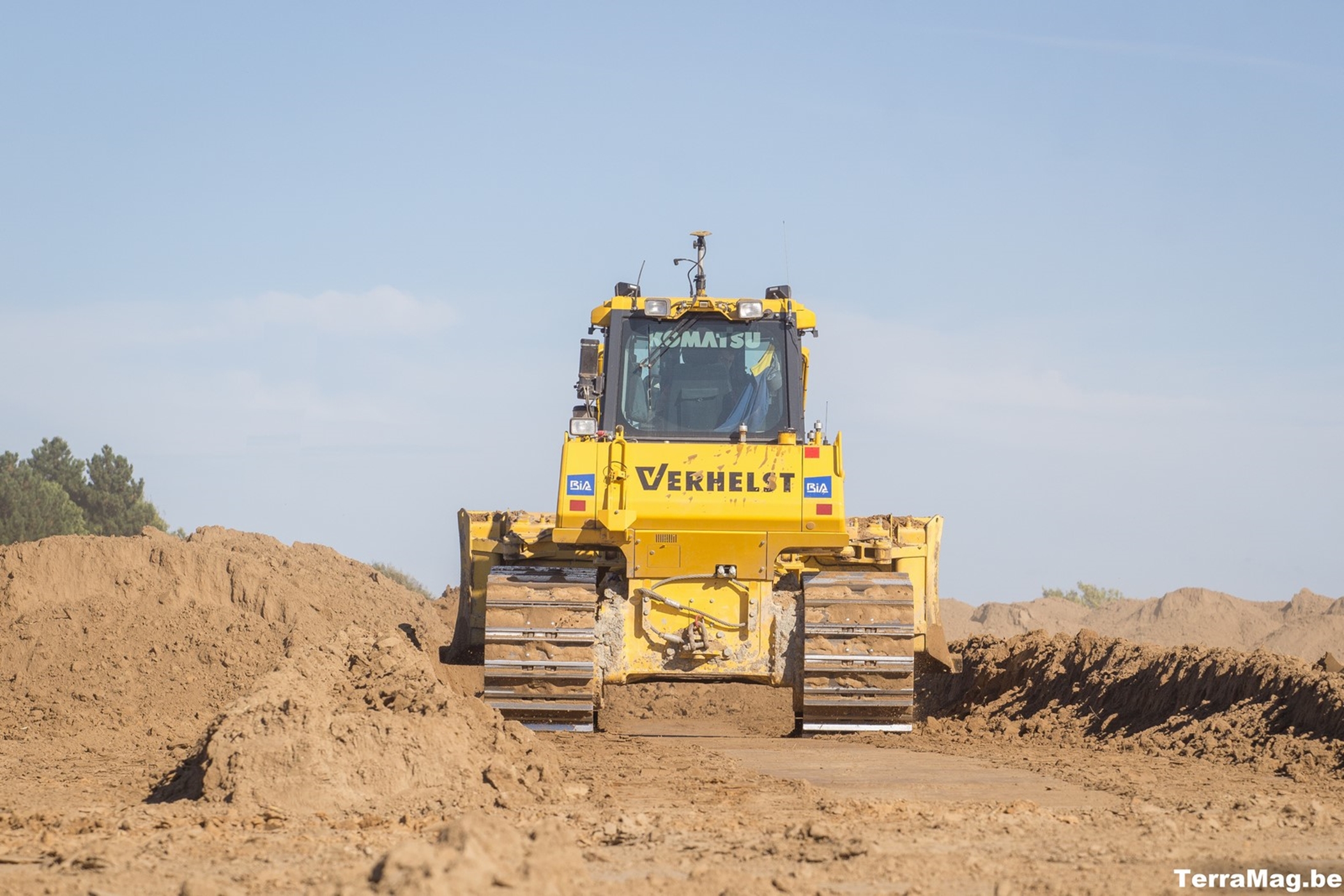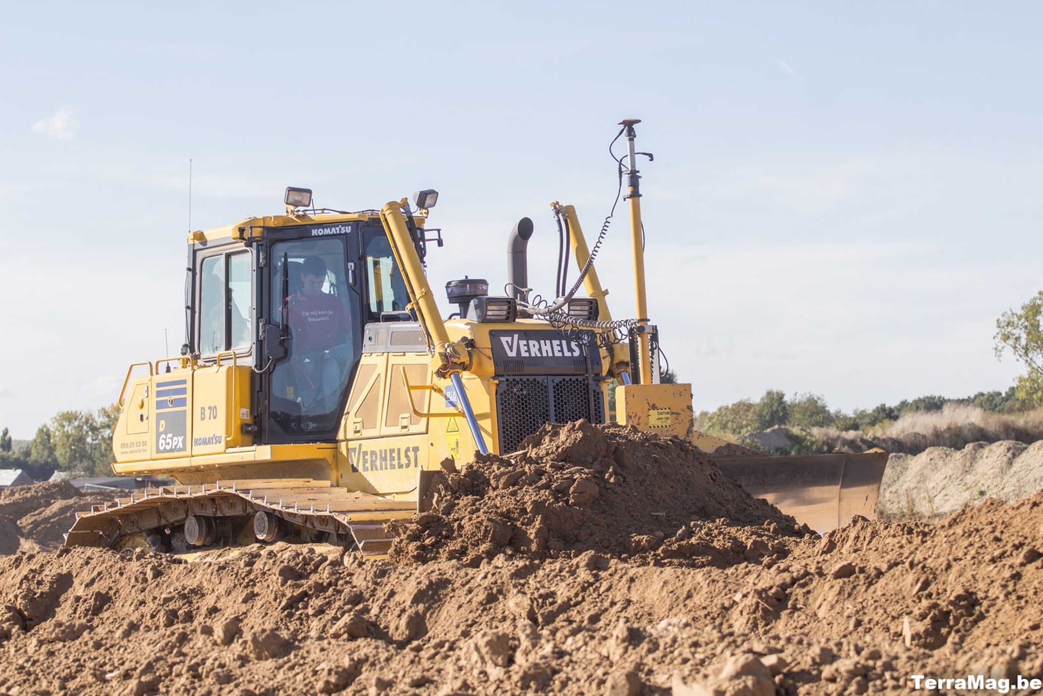 Om de bovenlaag te verwijderen, zodat het gemakkelijker is om deze te laden met een graafmachine, wordt de Komatsu D65PX van Verhelst ingezet. Deze bulldozer is uitgerust met een 210 pk sterke motor en heeft een eigengewicht van 20990 kilogram. Dit maakt het mogelijk om met het blad van 3.97 meter breed en een inhoud van 3.69m³, heel wat grond te verzetten.