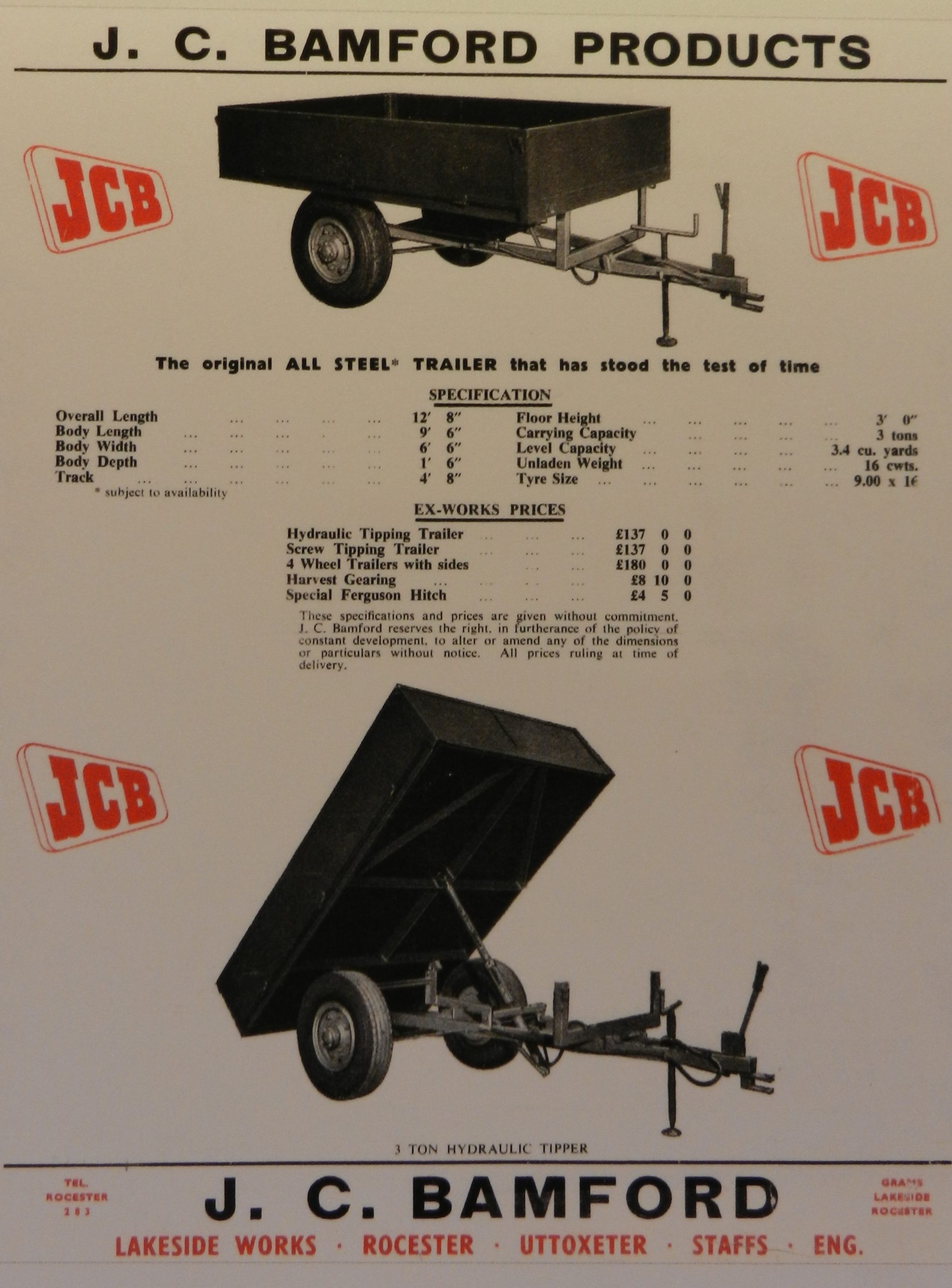 Joseph Cyril Bamford begon zijn eigen bedrijf in 1945 aan het einde van de Tweede Wereldoorlog. De eerste machine die hij voor 45 pond verkocht op de lokale markt was een tweewielige landbouwkipwagen. Drie jaar later had hij zes personen in dienst die zorgden voor de handmatige productie van een hydraulische kipwagen. In 1953 gaf Joseph Cyriel Bamford zijn bedrijf zijn eigen initialen en werden de eerste graaflaadcombinaties op basis van Fordson- en Nuffield- tractoren gebouwd.