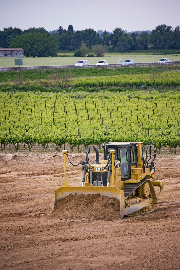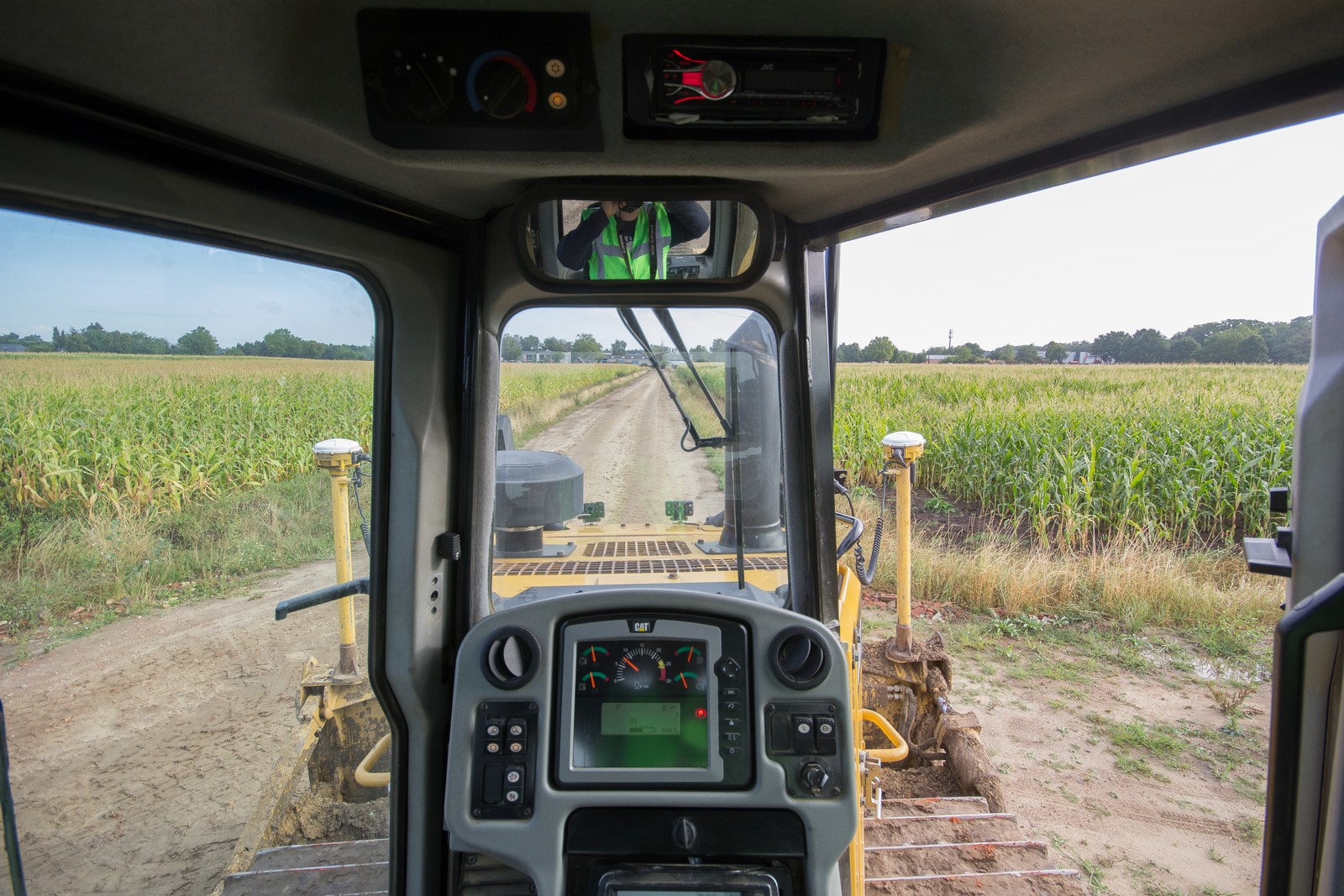 “Ik rijd graag met de D6T omdat je met deze zowel bruut grondverzet kan doen als taluds rijden en ook afwerken”, vult collega Franky De Meester aan. “Hij is minder geschikt voor wegeniswerken, dan is een D6N een beter keuze. De prestaties van de D6T zijn top , zeker op gebied van talud rijden. Je kan echt een heel schuine helling maken ten opzichte van andere merken, die ik op dezelfde locatie getest heb voor er een nieuwe D6 werd aangekocht!” Volgens Franky zijn de rupsen met het hoge aandrijfwiel ook een voordeel in nattere omstandigheden. “Wanneer het natter wordt en je wil achteruit rijden kan je met het mes een beetje drukken om de neus boven te houden. Met de rupsen die achteraan hoger oplopen heb je toch nog een kans om weg te geraken doordat de rupsen zich niet gaan ingraven. Het goede zicht op de hoekpunten van het mes is zeker ook een pluspunt tijdens het nivelleren. Kort samengevat, de Cat D6T is een echte krachtpatser in het veld”, zegt Franky nog.